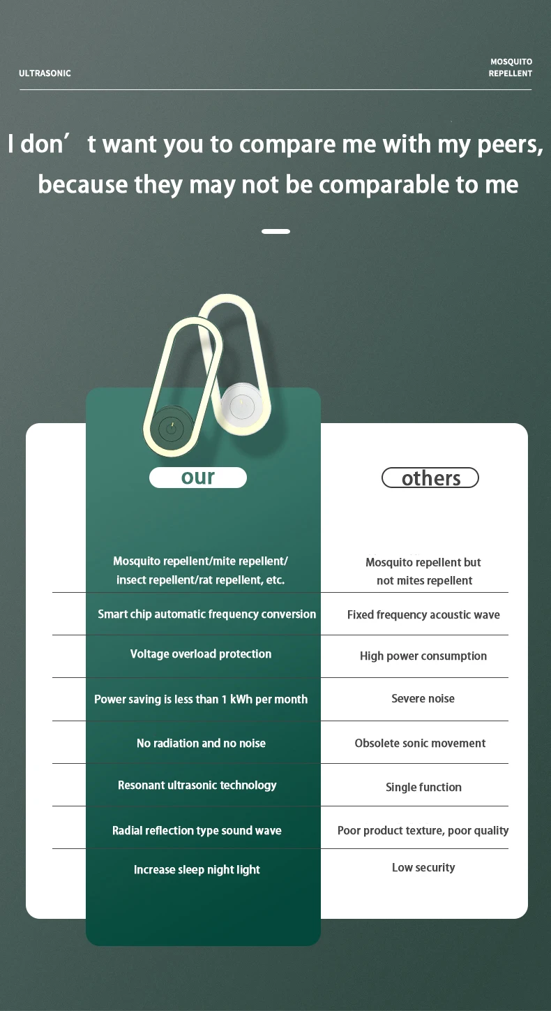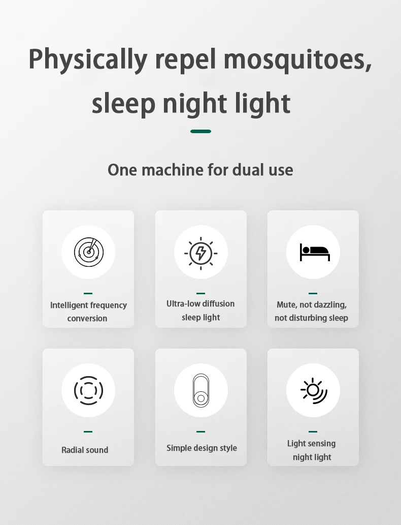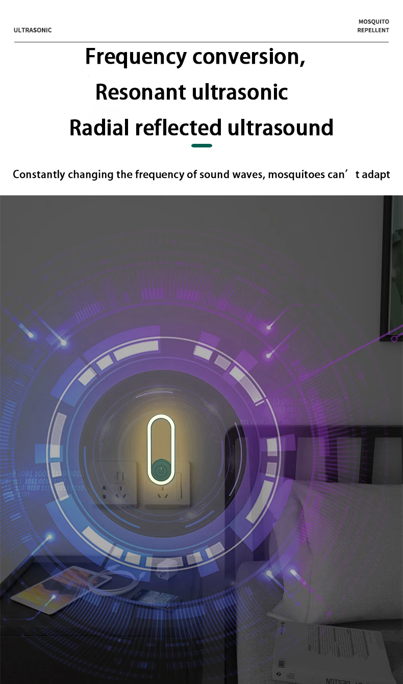 My ultrasonic mosquito repellent night light uses a frequency conversion design, which contains the frequency that mosquitoes, mites, mice and other small insects are offended. It is multifunctional. The frequency changes every second. In addition, the indicator light is a cycle of breathing every 40 seconds (using light waves to enhance the driving effect). But each kind of small animal has different sensitivity to sound waves. All different animals have different repelling effects. Some products are only used to repel mosquitoes, some are only used to remove mites, some are only used to repel mice, and some are used in the night light market. Now our one product can satisfy all functions!