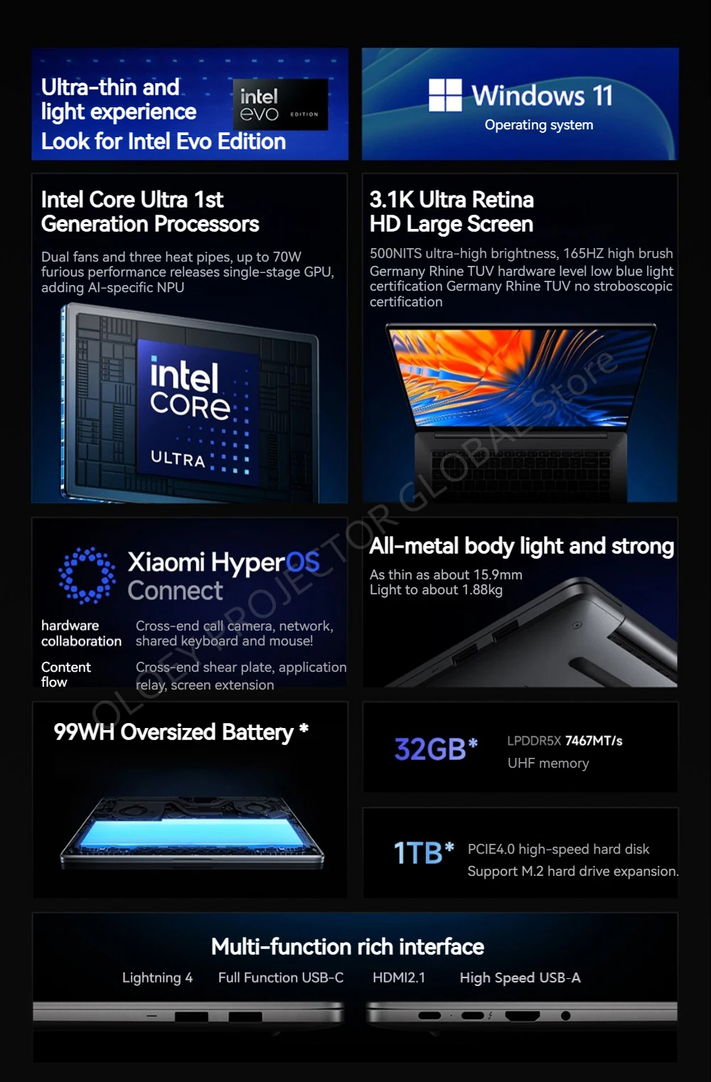 Xiaomi RedmiBook Pro 16 2024 intel Ultra 5/Ultra 7 Intel ARC Graphics NPU 32GB RAM 1T/2T SSD 3K 120Hz Screen Mi Office notebook