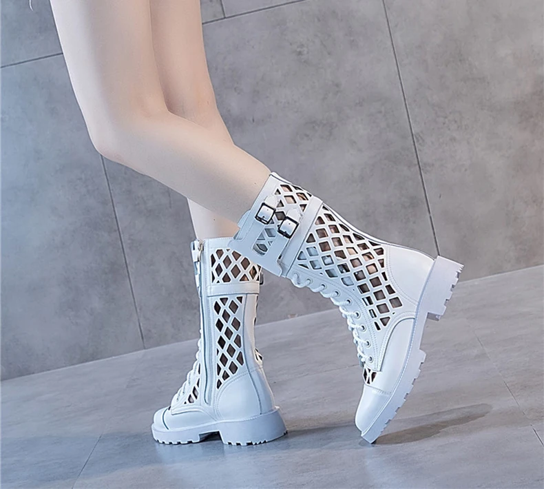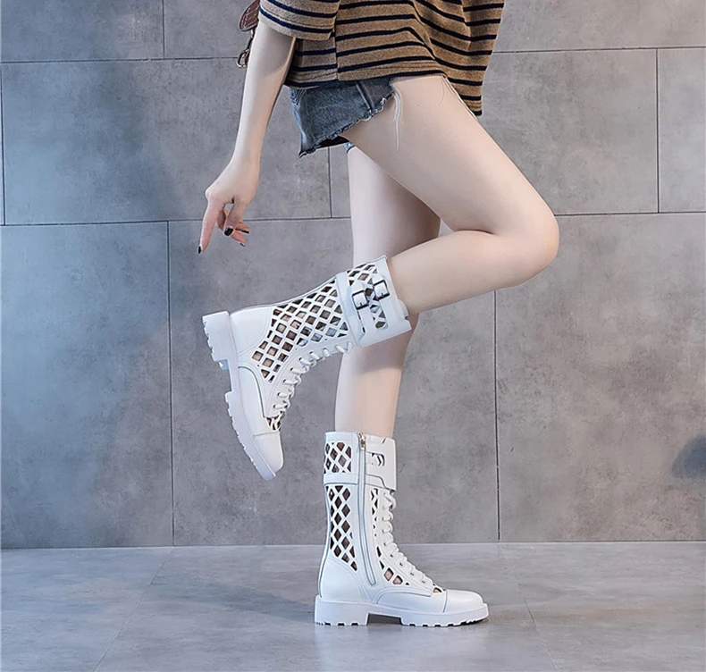 XMWRLW Women's Boots 2020 Summer Genuine Leather Woman Mid-Calf Boots Fashion Hollow Out Ladies Shoes Women Summer Boot Shoes