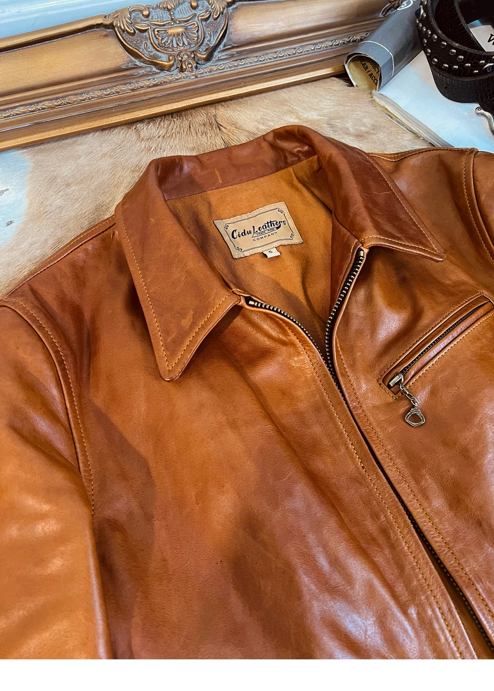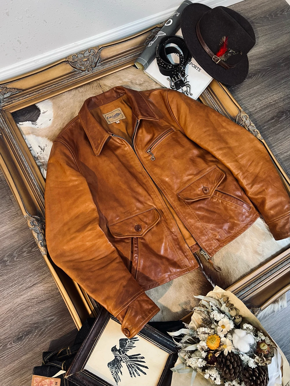 YR!Free shipping.Cidu Brand.luxury quality Sunset yellow soft cowhide jacket.West Vintage style real leather coat.fashion