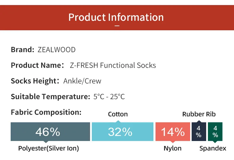 ✨Fabric Composition: 46% Polyester(Silver Ion), 32% Cotton, 14% Nylon, 4% Rubber Rib, 4% Spandex.