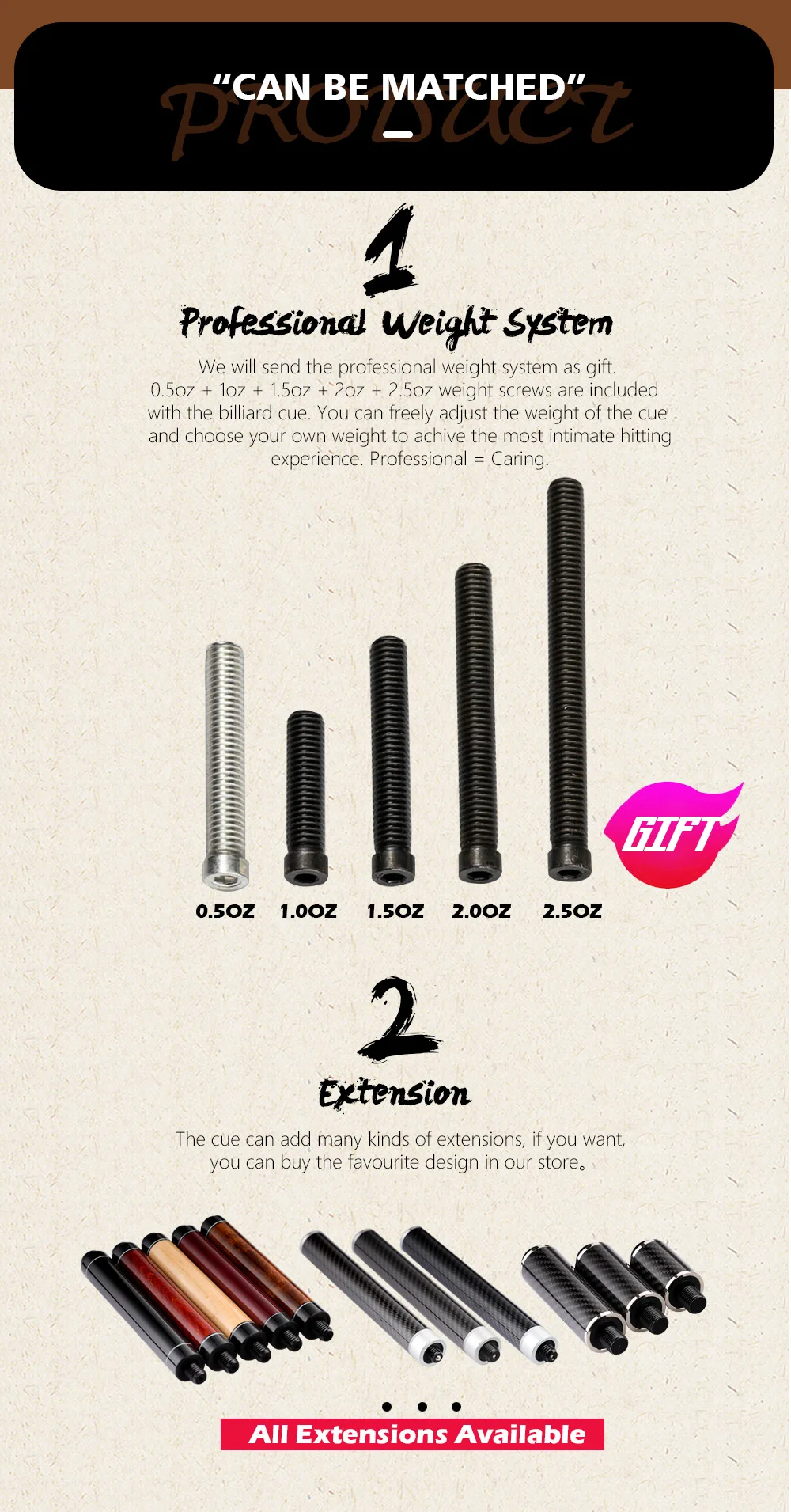 7.We will send the professional weight system as gift.0.5oz + 1oz + 1.5oz + 2oz + 2.5oz weight screws are included with the billiard cue. You can freely adjust the weight of the cue and choose your own weight to achive the most intimate hitting experience. Professional = Caring.